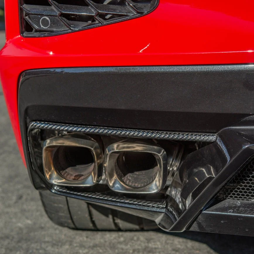 Crafted from high-quality carbon fiber, the bezels feature a lightweight yet durable construction that resists heat, UV rays, and daily driving conditions. The gloss carbon fiber surface finish blends seamlessly with the Corvette’s aggressive rear diffuser, emphasizing the exhaust outlets while adding a true motorsport-inspired look. This upgrade not only enhances aesthetics but also ensures a factory-quality fit that complements the Corvette’s aerodynamics.